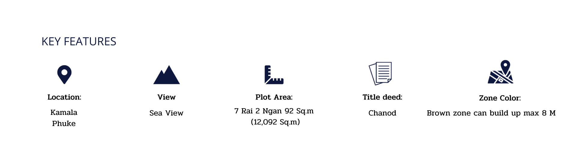 PROPERTY DESCRIPTION The land located on Kamala, Kathu district, Close to luxury hotel in Kamala. Total area 7 Rai 2 Ngan 23 Sq.wa (12,092 Sq.m) is on hill offer sea view Kamala and next to road. Surrounded by luxury hotel at Kamala. Investment luxury villas and 5 star hotel.
