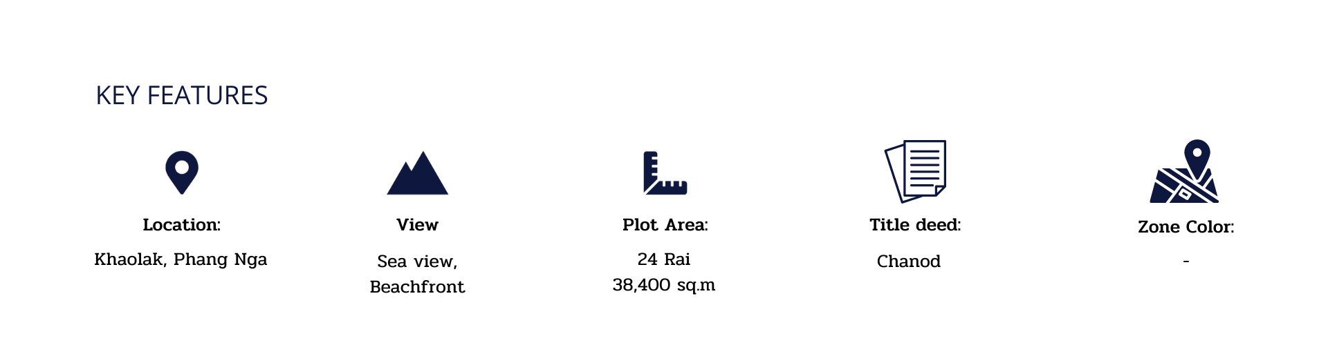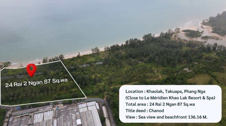 Land for sale located on Khoalak, Takuapa, Phang Nga (close to Le Méridien Khao Lak Resort & Spa). Total area 24 Rai (38,400 Sq.m). land plot offer sea view and beach front wide 135.16. Land next to road. Land suite for invest in villas and hotel beachfront. Title deed Chanod