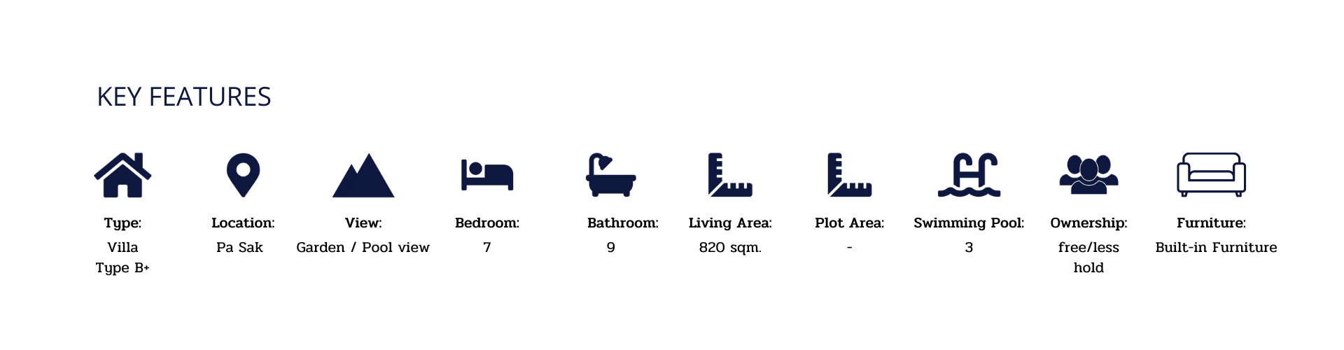 Spacious living areas and walkways to common areas offer secluded privacy. The community is suitable for families looking for a uniquely designed pool villa with full-service facilities.